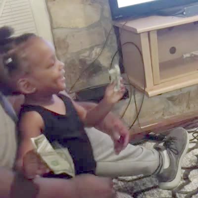A tot girl in a living room plays with cash that her grandma gave her. She walks across the room and stuffs the cash back into her grandma's bra.