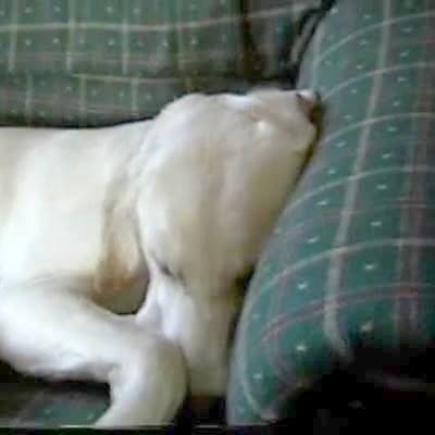 Big white dog sleeping on green chair barks and growls in his sleep.
