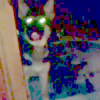 A terrier dog barks in a dark living room. When the lights turn on, the dog's eyes light up green as it barks at the camera.
