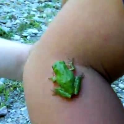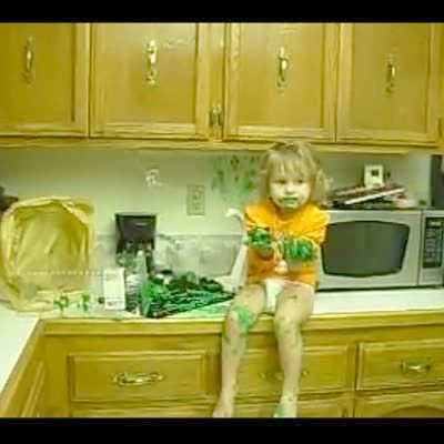 "Green Bean Nose Blow" Girl has green bean stuck up her nose. Mom holds girl's nose shut & tells her to blow out. Girl does, picks up the string bean & eats it. Gross.