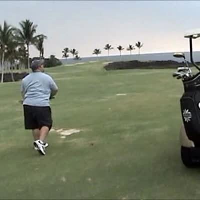 A man golfs outdoors in Hawaii. He tries to hit the golf ball onto the green, but it flies straight up in the air and lands on the man's head. The two clips after that are slow motion versions of the same clip. At 00:15 the full length clip plays again. On the the second swing, the man hits the ball correctly.