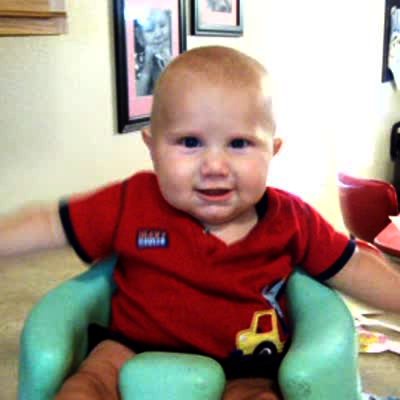 Baby boy in green seat cries immediately when mom makes a "moo" sound to him.