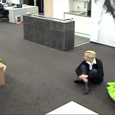 A woman yells "I'm melting" and pretends to shrink at a school, but she crashes into a green screen backdrop and knocks it down as she falls.