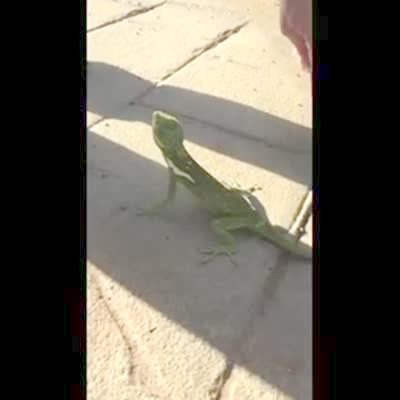Man has green lizard on his shoulder, sticks tongue out at it. Lizard bites man's tongue hard. . reptile, iguana.