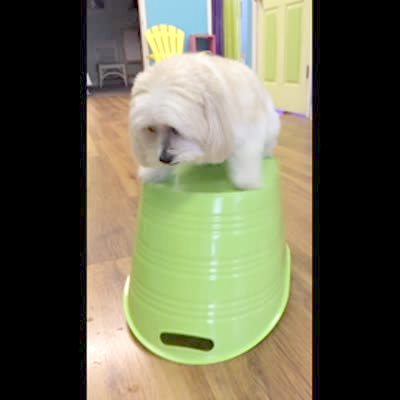 A dog struggles to maintain its balance on a green clothes basket at home, then poses in triumph when it recovers.