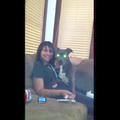 Woman pets gray pitbull dog on her lap on couch, dog's eyes turn eerie green when it looks at camera.