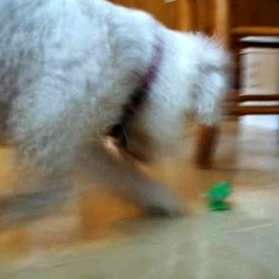 White poodle dog scratches rapidly at tiny green plastic toy hopping around on the kitchen floor.