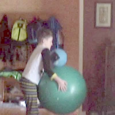 A young boy bounces a large green yoga ball with a smaller blue ball on top and the smaller ball hits him in the groin.
