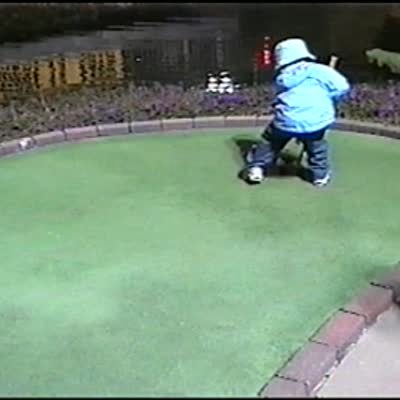 Tot girl miniature golfer keeps placing ball 1 inch from hole and missing, tries 10-12 times as relatives laugh in the background. She finally decides to place the ball in the hole, which also takes 2 tries just to do.