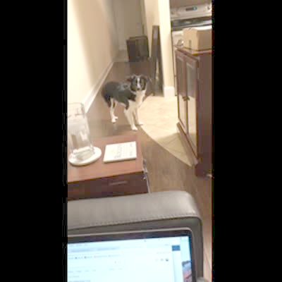 "Husky Howler" - A young boy and girl play guitar and drums. A Husky dog lays in the stairway and howls along with their music.