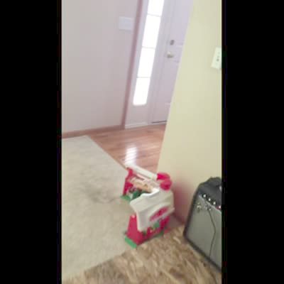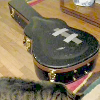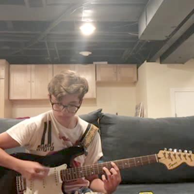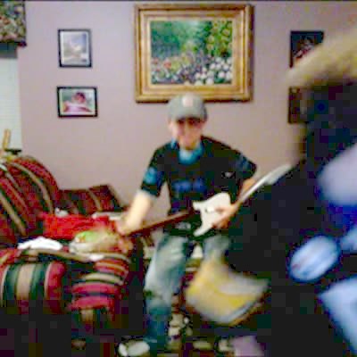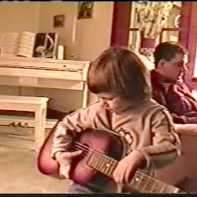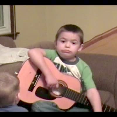 Boy tapes himself goofing around with an acoustic guitar. It breaks in half. he whimpers and yells (off camera) "Mom the guitar broke in half and I was just playing it!" The last part is hard to hear.