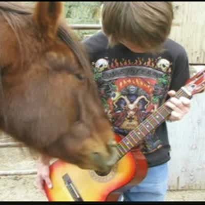 Boy holds guitar while a horse uses its face / mouth to play the instrument. Farm.