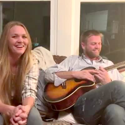 A man and woman sit on a living room couch and get ready to sing a song for the camera. The man bangs on his guitar and the head snaps off.