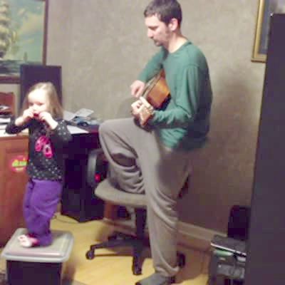 A man and a little girl dance and play guitar and harmonica before the girl falls off a box. Short tail.