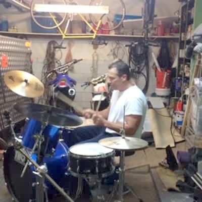 A man plays a drum set poorly in a garage indoors. He stands up and accidentally breaks the light above him with a drum stick at :52. He looks to the camera and says "Well, that was exhilarating. What should I play next? Guitar?"