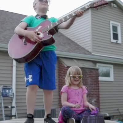 2 girls sing "We Will Rock You" in the backyard. Tot boy hits girls with Power Wheels truck. 1 uses a cooler as a drum & the other plays guitar.
