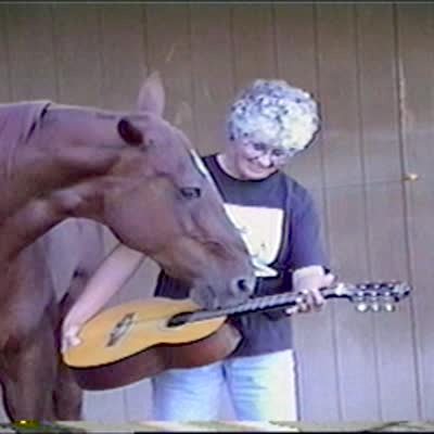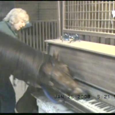 Horse with a tiara star sunglasses rubs her mouth against the keys of a piano in the barn, plays music. The horse also plays the guitar with its lips. Scarlett the Starlet. Long for edit.