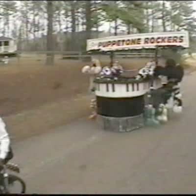 Man rides unicycle, wears cowboy hat, plays guitar - and falls; EXT. ROAD - FLOATS - DAY Puppetone Rockers