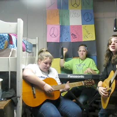 2 teen girls pretend to play guitars, another teen girl pretends to play the drums and keyboard. They lip sync to the song "Walking on Sunshine." The girl pretending to play drums slips & falls off her chair, knocking over the keyboard. Short tails.