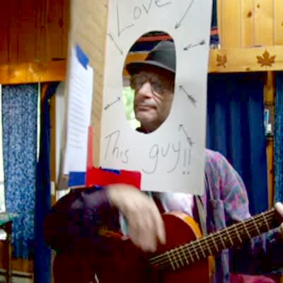 Man sits in a deck chair and plays guitar and sings with teen boy. The chair suddenly breaks, he falls over.