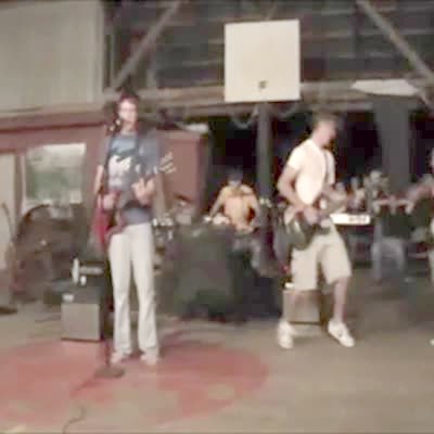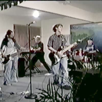 Teen boy jumps and falls down while playing guitar in band at talent show, keeps playing. (Foo Fighters song) performance.