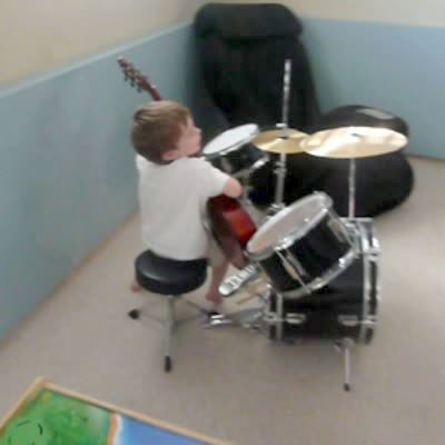 Tot boy plays guitar, breaks string, says "oh, shit."