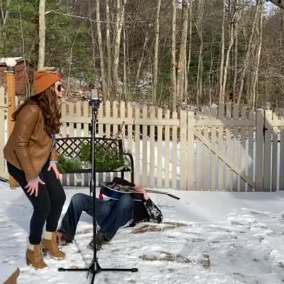 A man and woman record a music video in a snowy yard. The man spins with a guitar and slips and falls on the ground.