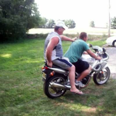 Man rides a small motorcycle with another man riding on the back. Guy on the back falls off & lands hard on the grass as the other man speeds away.