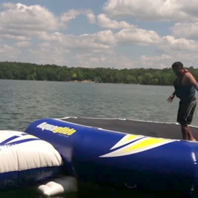 At 0:22, a man jumps on the blob to launch another guy into a lake but he just ends up bouncing himself in the water.
