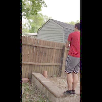 A man falls while trying to jump over a fence and breaks a piece of the fence outdoors.