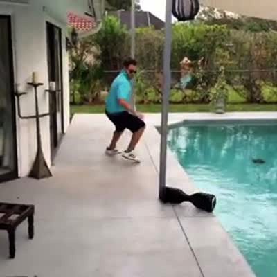 A man rides a hoverboard by a pool outside and falls off then the hoverboard lands in the pool.