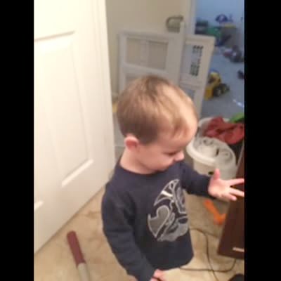 Tot boy laughs when getting hair cut with clippers. Funny laugh.