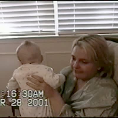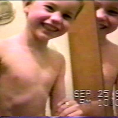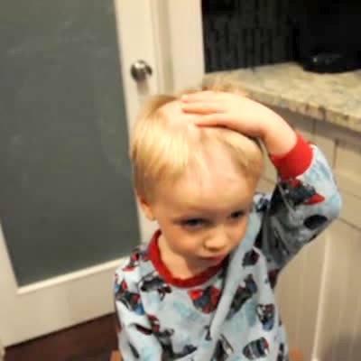 A young boy pretends his tot brother shaved his own head and asks why he would do it, but his mom asks how the tot boy could have done it when his brother holds the discarded hair in his hand. The woman turns the camera on the tot boy, who has a shaved patch taken off the top of his head.