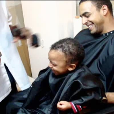 Haircut; Boy falls out of salon chair, caught by barber legs first.