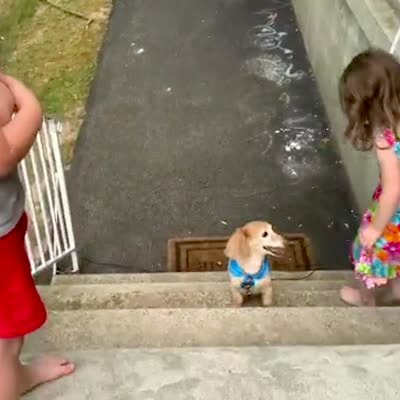 A woman tells her young boy and girl she traded in her old dog for a new puppy in the front yard. The boy starts to cry then looks at the dog and says "wait a second, you gave him a new haircut."