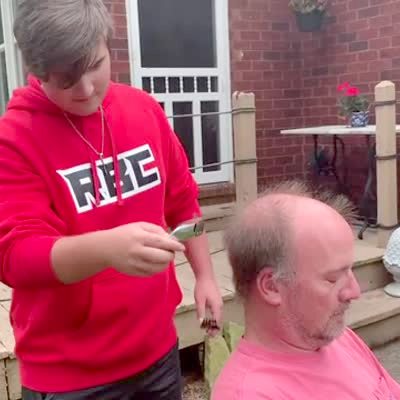 "Boy gets haircut" The razor part fell off during cutting, man says he made a flea path on son. Boy has male pattern baldness, sister reveals it from underneath baseball cap. Says wife is going to kill him.