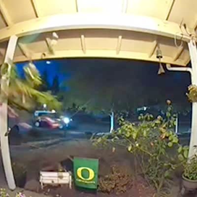 A woman walks out the front door of a house, then she trips over her own purse strap and spills the contents in the driveway. Security footage