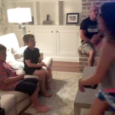 A young girl wishes dad a "Happy Birthday" and a young boy refuses to do so.