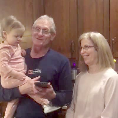 A young girl hides behind in the hallway. She and the other young girl behind the camera run into the kitchen and yell Happy Birthday at a senior man. The senior man jumps up, clutches his heart and says, "What the hell?" The girls laugh and the man walks into the other room to sit down.