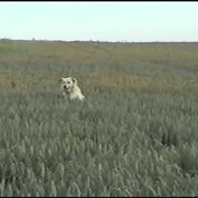 Two dogs leap / jump through hay field, pop their heads up. Grass is very tall, can't see the dogs until they jump. Silly pet trick.