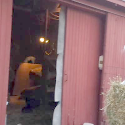 While she tires to steal her lambs' food in a barn, a sheep gets stuck in between the fence posts and tries to wiggle her way out.