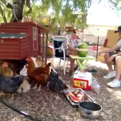 At 9:15 A man and woman wrap rubber bands around a watermelon outdoors while several chickens gather next to them when the watermelon explodes and scares all the chickens away.