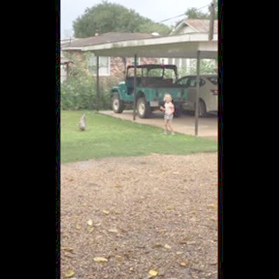 A young girl yells at a rooster until the rooster chases after her and she screams and runs away