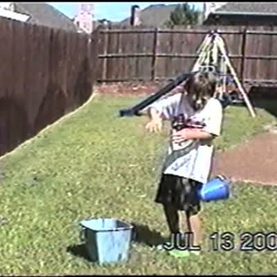 Tot boy fills water bucket to try and throw on senior man, boy runs & ends up pouring water on himself instead.
