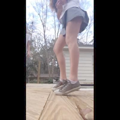 Teen girl screams and chases bird on boardwalk, she falls down hard. Payback. .