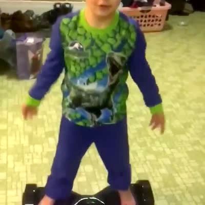 A young boy says he's a natural on a hoverboard, then loses his balance and falls as he spins around.