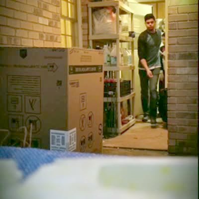 A woman tries to scare her teen boy, but when she jumps out of a box it falls over in the garage.