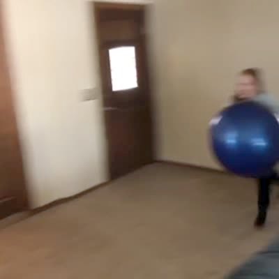 Two teen girls run and collide into each other while they hold yoga balls. They fall to the ground. One of the balls hits a side table and breaks a lamp, frames, and knocks over a fish bowl.