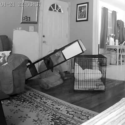 A man sleeps on the living-room floor and a woman runs and tries to climb over a pet gate but her foot gets caught and she trips and falls and knocks a lamp over and it hits the man in the head. Security footage.