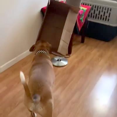 A dog walks around a house while he carries a large box in his mouth, and he repeatedly hits the box against walls and a lamp.